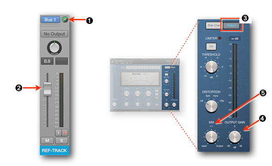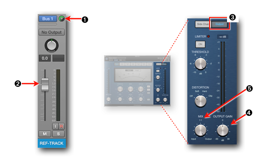 - Fader: Use the Fader ➋ on the Reference Track''s Channels Strip to adjust the level you are sending to the Compressor. The Send has be set to "Post Fader" or "Post Pan".