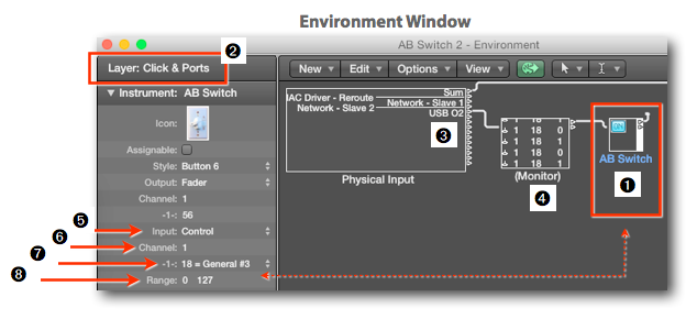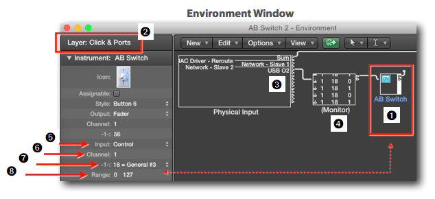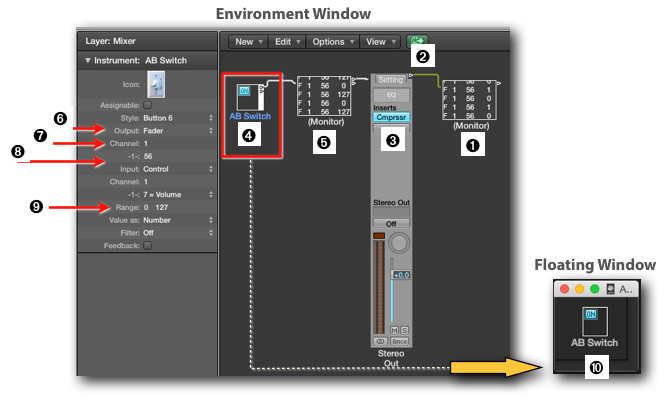 Although the previous option provides a dedicated, always visible, A-B Switch button, you still have to move your mouse over the button and click on it. For a power user, that is already too much work and it would be easier to use a dedicated button on an External MIDI Controller as an A-B Switch. Because we are using Logic and its omni-potent Environment, creating such a solution is a piece of cake: