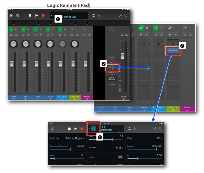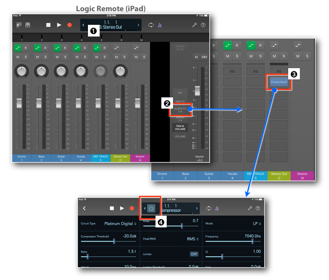 - This is how the previous Project I used looks like in Logic Remote ➊. Tap the button "Audio FX 1-8" ➋ to change the view showing the Audio FX Slots.