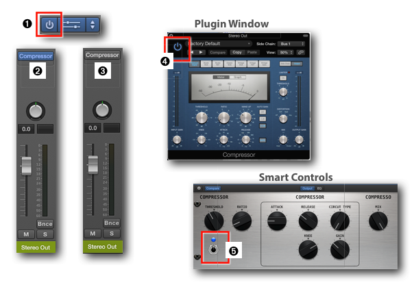 - Plugin Window: If you have the Compressor Plugin Window open, click on its Power Button ➍ in the upper-left corner.