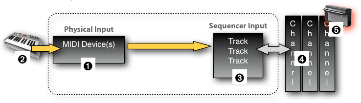 - You route the incoming MIDI Signal, coming from the Physical Input ➊ (and therefore from your MIDI Keyboard ➋) directly ➏ to that Channel Strip ➎.