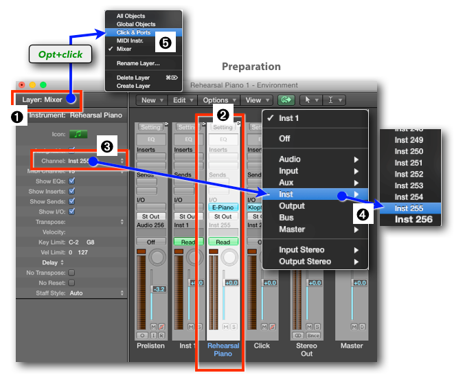 - While the Channel Strip ➋ is still selected, hold down the option key, click on the Layer Selector ➊ and choose "Click & Ports" ➎ from the popup menu. This moves the Rehearsal Piano Channel Strip to that Layer.