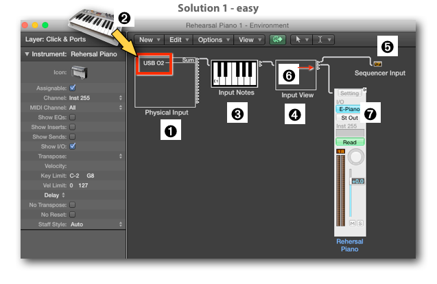 - You create a Channel Strip in the Environment that has the piano patch loaded ➎ to function as your Rehearsal Piano.