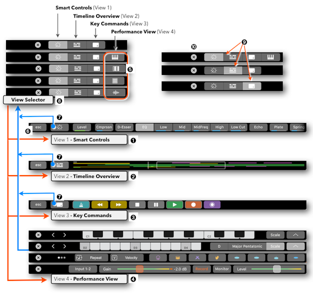 - Close View Selector: The View Selector has the button of that Main View highlighted ➒ from where you accessed this View Selector. Tapping the Close button ➓ will go back to the view of that highlighted button.