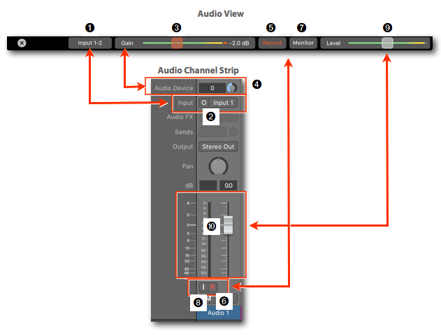 - Input Monitoring Button ➐: This button mirrors the Input Monitoring Button ➑ on the Channel Strip.
