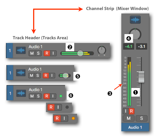- Track Header ➋: The horizontal meter has no scale, is shorter, and gets even shorter when you resize the Track Header horizontally. ➎ At its minimum size, the meter changes into a single LED that can only have three colors ➏, gray (no signal), green (signal), and orange (clipped signal).