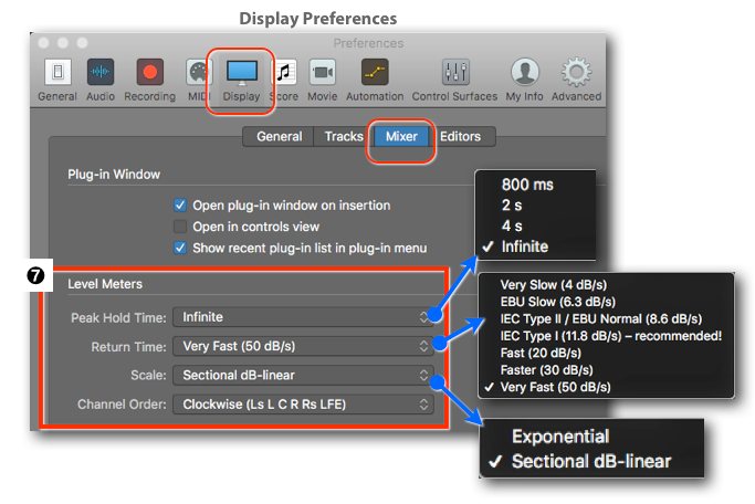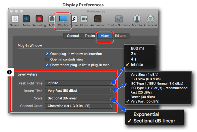 - Control Bar ➐: Click on the Pre-Fader Metering Button in the Control Bar. This button has to be made visible in the Control Bar Configurations Popover (Main Menu Window ➤ Customize Control Bar and Display...).