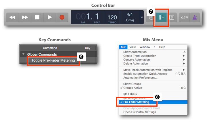 - Key Command ➒: You can use the Key Command "Toggle Pre-Fader Metering", which it is not assigned by default.