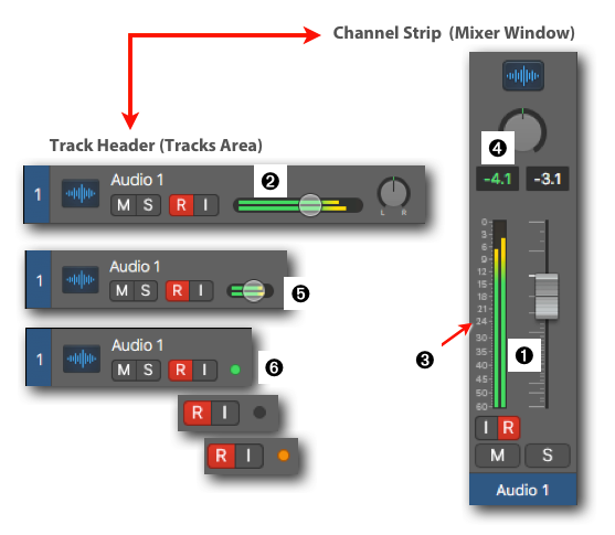 The Level Meter is displayed on the Track Header ➋ in the Tracks Area and on its corresponding Channel Strip ➊ in the Mixer Window.