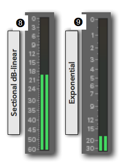 - Scale: The "Sectional dB-linear" ➑ option is selected by default, but if you need a higher resolution in the upper meter range, you can choose the "Exponential" ➒ option. The screenshot on the right shows the same -20dB level displayed on the two scales.