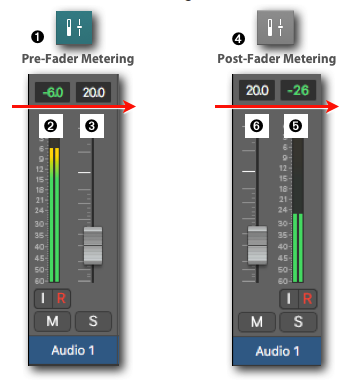 - Menu Command ➑: Select from the Main Menu Mix ➤ Pre-Fader Metering.