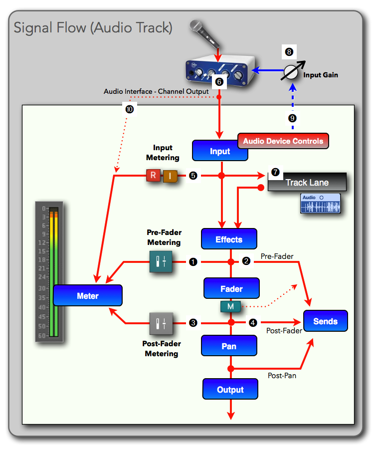 So technically, while in Input Metering Mode (enabled Input Monitoring Button or Record Enabled Button), you are measuring the output ➓ of the audio interface, the specific channel you are feeding into the Audio Channel Strip.