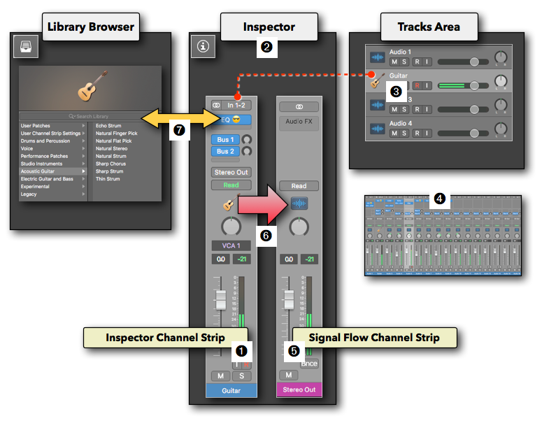 Although the official term is "Inspector Channel Strip", the one linked to the selected Track ➌, there is always a second Channel Strips right next to it. This one on the right is referred to as the "Signal Flow Channel Strip" ➎, because it shows a Channel Strip that is receiving an audio signal ➏ from the Channel Strip on the left ➊. It is part of its signal flow, for example, the Output Channel Strip or an Aux Channel Strip the signal on the left is routed to.