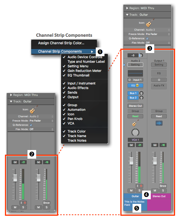 - This way, the Channel Strip can display only the basic controls ➋, all the controls ➌, or whatever controls you need to see.