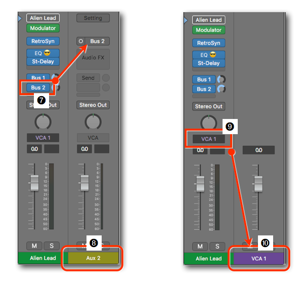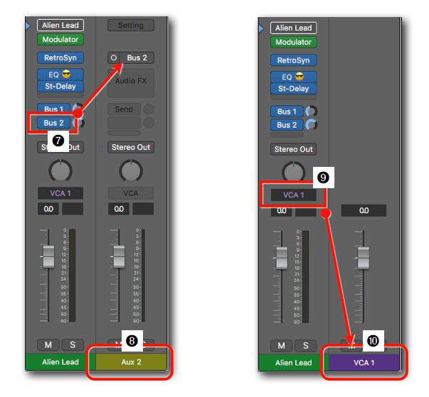 If you click on any Sends Button ➐ of the Inspector Channel Strip, then the Signal Flow Channel Strip on the right shows the Aux Channel Strip ➑ that uses that Bus as its input.