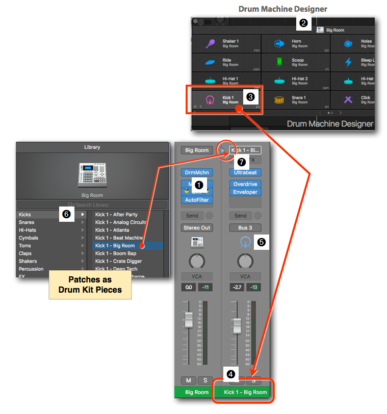 - Another powerful "side effect" is that now the Library Browser automatically displays the available Patches ➏ for that Drum Kit Piece. Just click on one and you swap out that sample.
