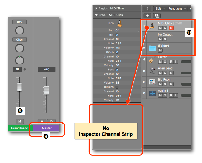 - External MIDI Track ➑: If you selected an External MIDI Track in the Tracks Area, then the Inspector Channel Strip will display that special "MIDI" Channel Strip. But remember, there is no audio signal passing through an External MIDI Track (only MIDI). In this case, the Signal Flow Channel Strip shows the Master Channel Strip ➒.