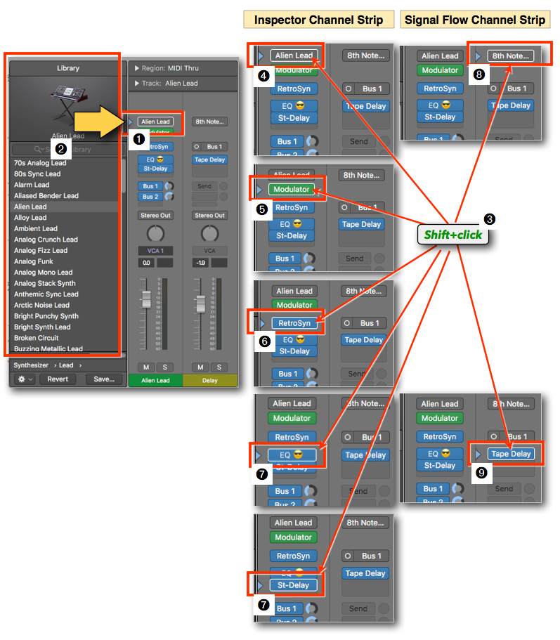 - You can also select one of those buttons ➑ ➒ on the Signal Flow Channel Strip (if available) to load settings into those components.