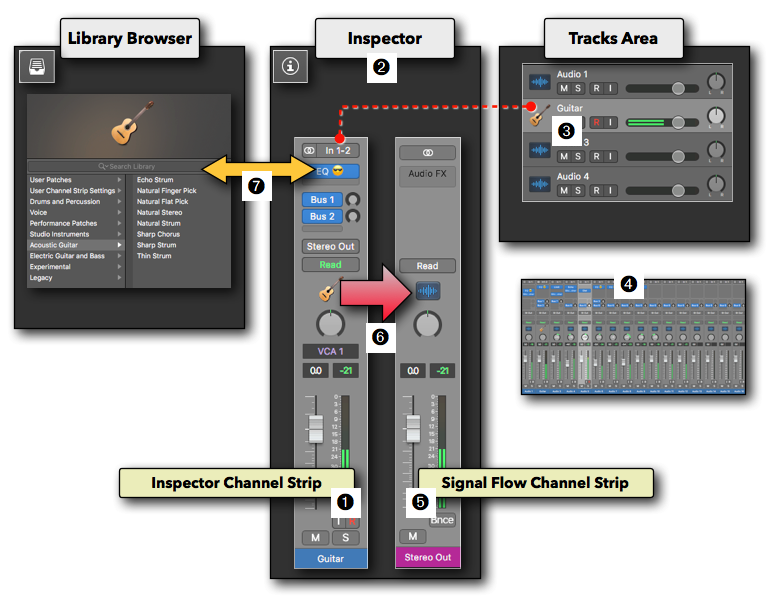 - Selecting a Track ➌ in the Tracks Area (not a Channel Strip in the Mixer!) will automatically display the Channel Strip that is assigned to that selected Track in the Inspector, as the "Inspector Channel Strip" (the one on the left).