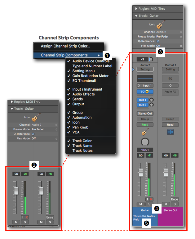 - You can set the Channel Strip Components independently from the setting of the Mixer Window, so you can choose which controls you want to see on the Inspector Channel Strip. Ctr+click on the Channel Strip background and select from the Shortcut Menu ➤ Channel Strip Components ➤ ➊.