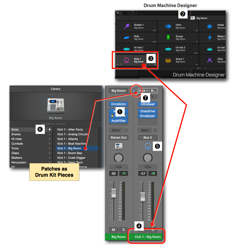 - Now when you click on any Cell in the Drum Machine Designer Window (in this example the Kick 1 ➌), the Signal Flow Channel Strip shows the Channel Strip ➍ that specific Drum Kit Piece is routed to. This way you can quickly adjust the sound of individual Drum Kit Pieces on the Signal Flow Channel Strip without opening the complex Summing Stack in the Mixer Window.