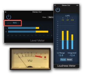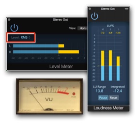 - RMS Meter and VU Meter: A Peak Meter that you can set to RMS (“Root Means Square”, a fancy word for “average”) or a traditional VU Meter is technically still Level Meters and not Loudness Meters. They measure the electrical level of an audio signal. However, their characteristics just happen to be close to how we perceive loudness by measuring and displaying the average signal level (or the energy of the signal) instead of the peak level of a signal. Also, keep in mind that an RMS Meter can read the average level but not a long-term average as the Integrated Loudness Meter can (more on that later).