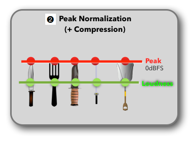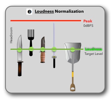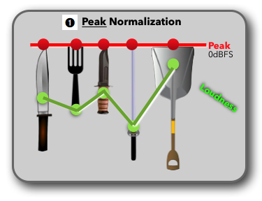 Before getting into the details about Loudness Normalization, here are three simple diagrams (inspired by Florian Camerer’s entertaining AES presentation from 2011), that demonstrate the concept of Loudness Normalization compared to Peak Normalization.