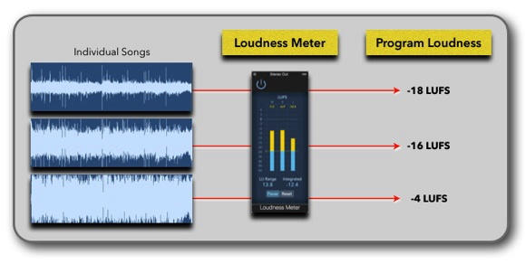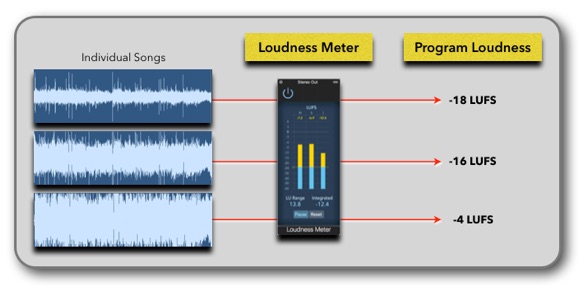 When a song is played on a Loudness Normalized system, it looks at the Program Loudness for that particular song and raises or lowers the level to adjust the Program Loudness of that song to the Target Level of the system.