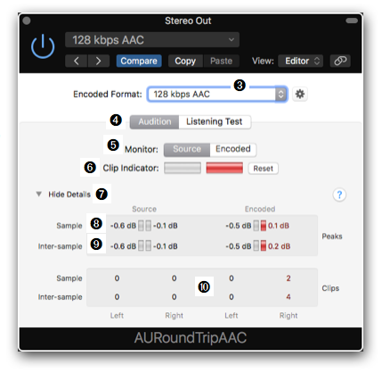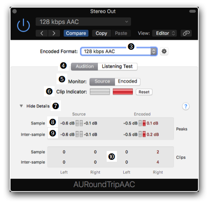 - Clip Indicator ➏: The two bars below light up red when the source signal or the encoded signal is clipping.