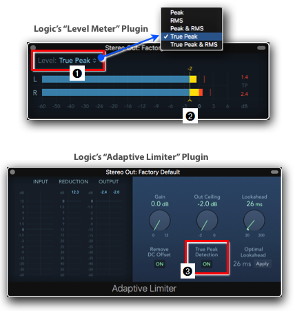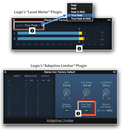 Here is one little detail worth mentioning regarding True Peak. If you use a limiter on the Output Channel Strip, make sure that it also uses True Peak Detection ➌. You can find this valuable feature in more Limiter Plugins nowadays, including Logic’s own Adaptive Limiter.