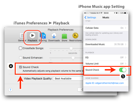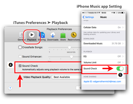 The Playback Preferences in iTunes ➍ and the Settings for the Music app on iOS ➎ has a checkbox labeled “Sound Check”, which activates Loudness Normalization for all songs in your iTunes Library at a Target Level of -16 LUFS.