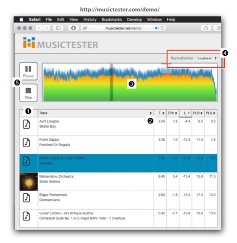 - You have the Play/Pause and Stop button ➎ to play the playlist, and you can also use the spacebar on your keyboard to step through the playlist during playback for direct comparison of the songs in your playlist.