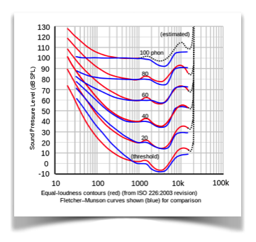 You can see that the Loudness Contours are getting flatter with higher playback volumes (y-axis). That’s one of the reasons why “louder sounds better”, because when you increase the playback volume of a song, the ear’s perception is that the lower and higher frequencies will increase more compared to the 3kHz range, making the same song sound better due to the wider frequency range).