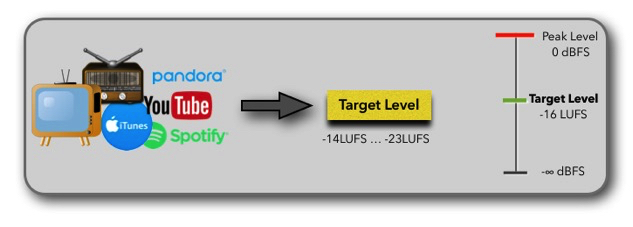 A system (broadcaster, streaming service, personal music player, etc.) that uses Loudness Normalization sets its Target Level (-14LUFS … -23LUFS). This is the Loudness reference that all the audio material played on that system is aligned to. Remember, "the good thing about standards is that there are so many of them". This is also true for the Target Level. European broadcast systems use a Target Level of -23LUFS, America uses -24LUFS, and most audio streaming services use a higher Target Level close to the AES recommended -16LUFS.
